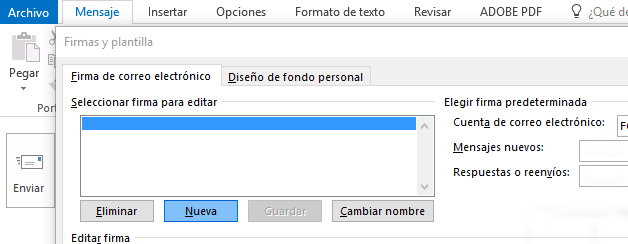 Seleccionamos nueva en el cuadro de diálogo y escribimos un nombre para nuestra firma