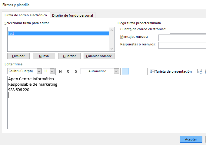 En el cuadro editar firma, escribimos el contenido de nuestra firma y aceptamos