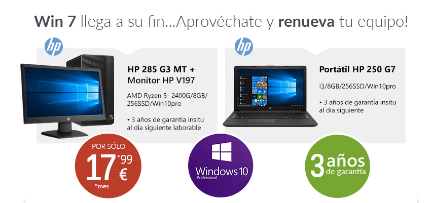 Migrar si o si, a un nuevo sistema operativo. No hay otro camino, si todavía eres un usuario de Windows 7 el salto lógico sería pasarse a Windows 10 (ya que mantiene las mismas especificaciones mínimas de hardware que sus dos versiones anteriores). Para ponértelo más fácil, en Apen hemos preparado 2 ofertas en equipos, un PC y un portátil, de altas prestaciones.